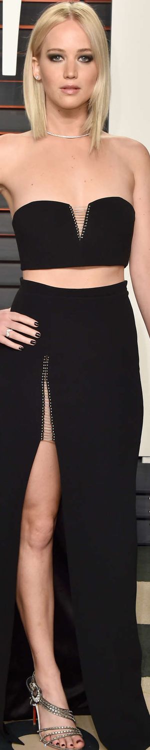 JENNIFER LAWRENCE in a two-piece Alexander Wang dress with “barbell piercing detail” in the slit, plus a slender Anita Ko diamond choker and Christian Louboutin sandals at the 2016 Vanity Fair Oscar After-Party in Beverly Hills, California, 02/28/2016 ..rh